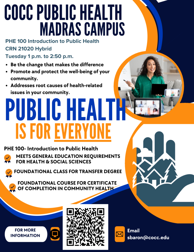 With the start of classes in 2025, Central Oregon Community College has prioritized offering Public Health courses every term on the Madras, Prineville, and Redmond campuses, in addition to our scheduled classes on the Bend campus. This renewed focus ensures that all students have access to these foundational Public Health courses no matter where they live.